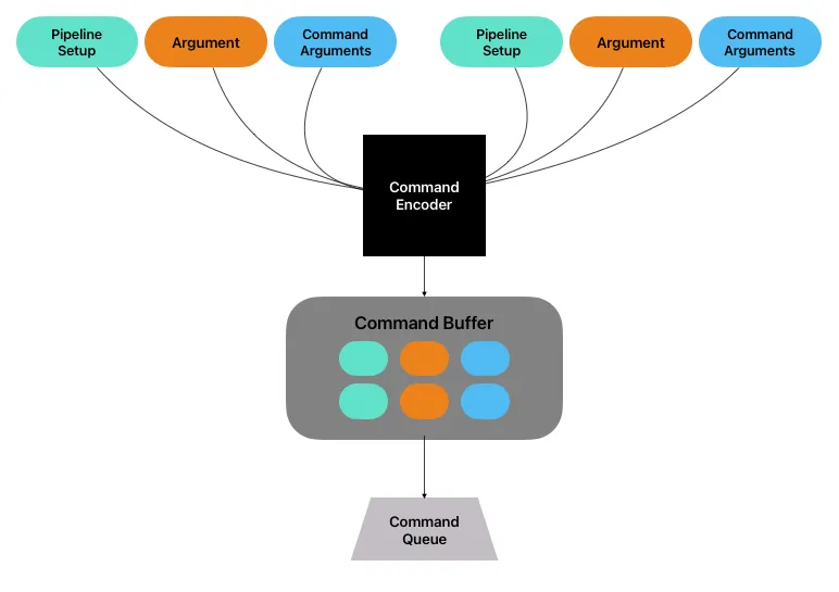 A command encoder is used to encode GPU commands into a command buffer. After the pipeline state and arguments (buffers) are set up (i.e., we chose a pipeline state and allocate buffers for input and output), a command buffer would take all of them, create a package that will be executed on the GPU. These packages are sent into command buffer.