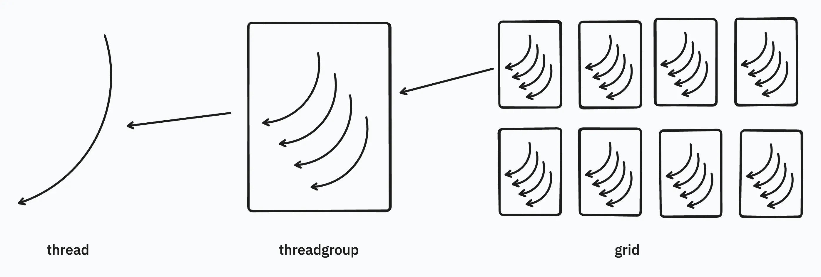 All in all, we can simply conclude that: The basic unit in metal is a thread. Multiple threads consists of a thread group (warp/block in cuda). Several thread groups makes a grid.